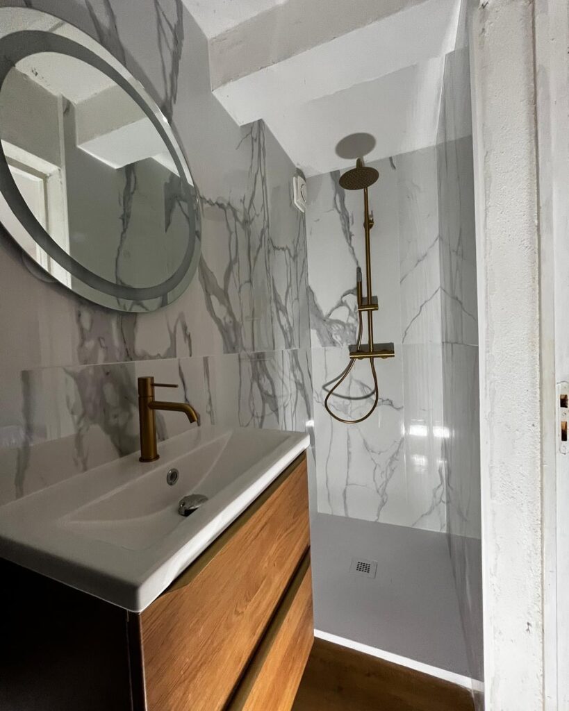 Nouvelle salle d’eau installée avec soin, nos plombiers ont réalisés la pose des sanitaires, pour un espace à la fois fonctionnel et moderne.